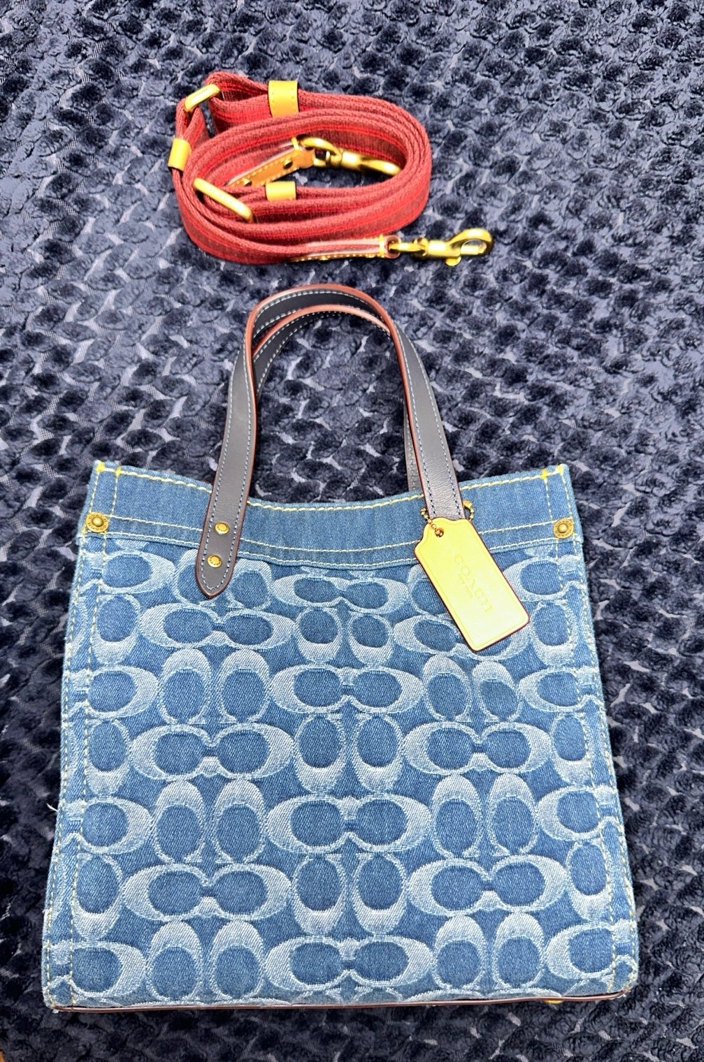 The interior and the denim material in pretty good condition. Worn on a couple trips. Includes the long strap and has hang tags. Comes with a dust bag.