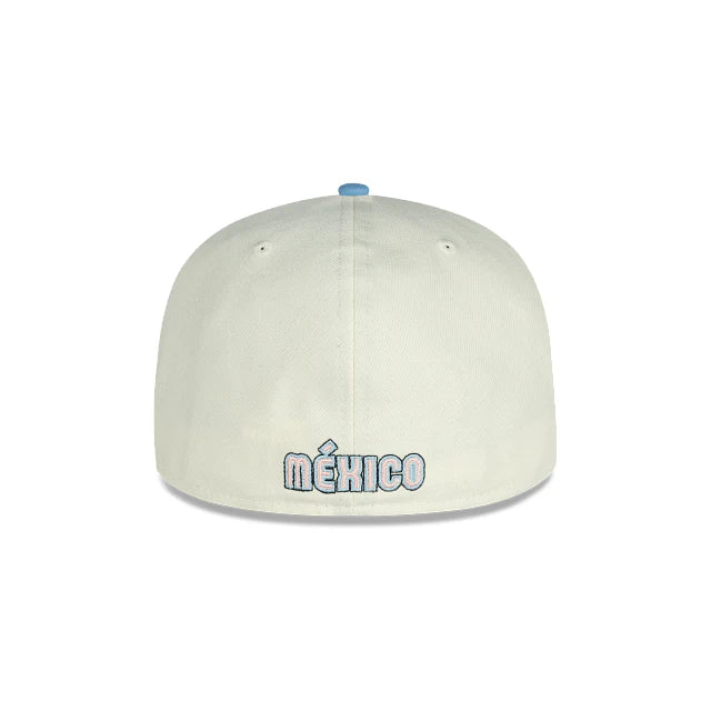 Show off your vibrant style with the New Era Mexico Wordmark 59FIFTY Fitted Hat in Chrome and Light Blue. This bold cap combines a sleek chrome finish with refreshing light blue accents, making it the perfect playful accessory for any outfit. Designed for a comfortable, snug fit, it’s ready to keep you looking sharp while celebrating Mexico in style.